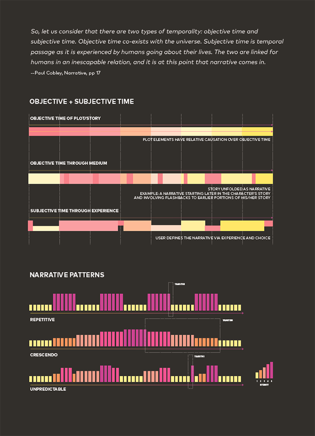 So what are the rules, the design principles of narrative? For decades artists and designers have creatively explored the dialogue between time-based and narrative structures and design. Yet, a cursory review of a textbook on literary narrative provides you the beginnings of a handbook for building living narratives- -human experience. Expectation, suggestion, detours, speculation, anticipation, retrospection--how do we channel these real experiential narrative concepts? How do they relate? How are they structured? Realized? These are the modes and constructs of narrative that underwrite all interactions between humans and objects- -we should know them, practice them and deploy them in our creative work.