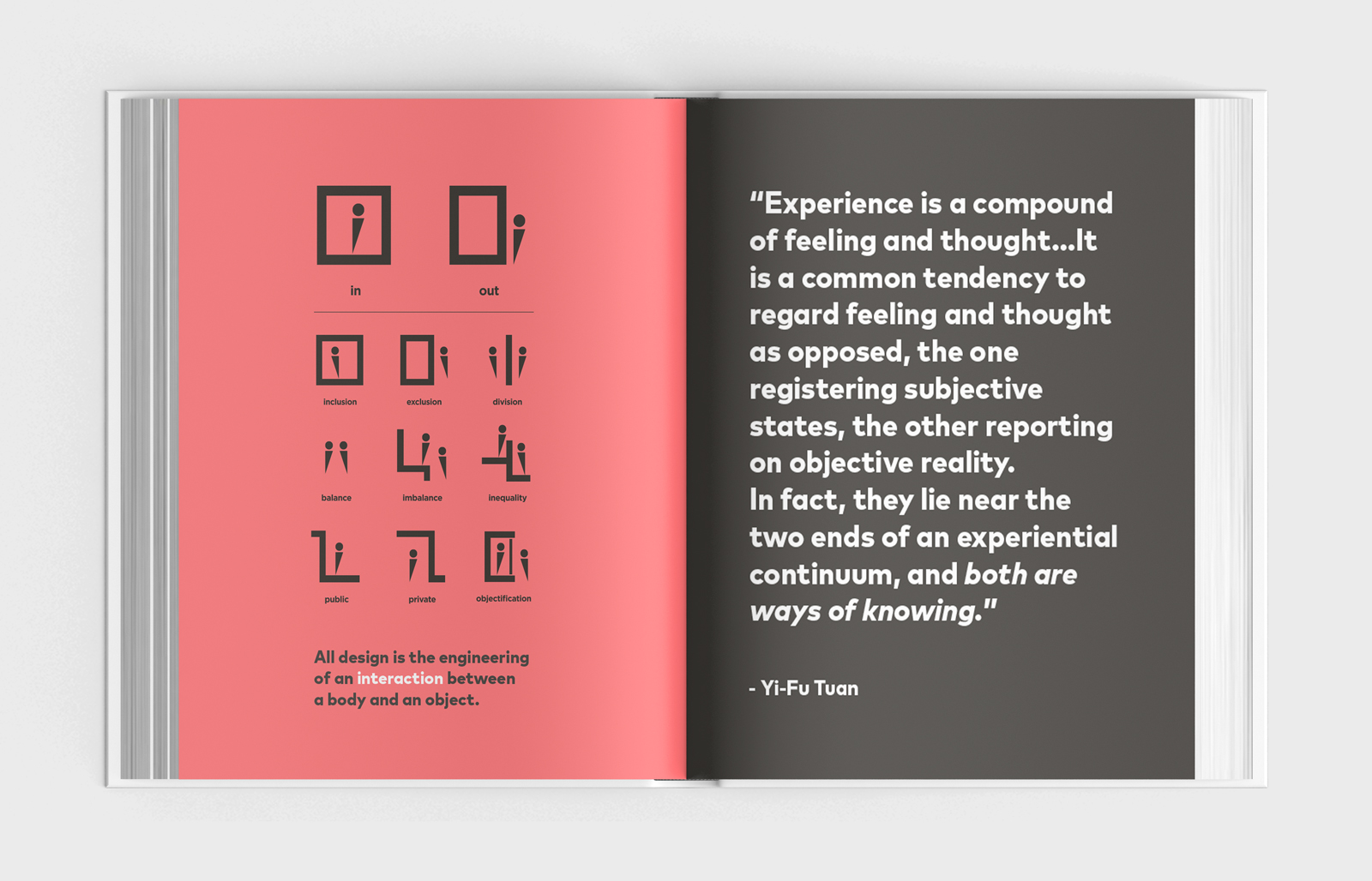 The theory proceeds from the notion that the object is not what is being designed, but in fact the experience--which is contingent on hundreds of unique human-centered conditions, not simply the facets of the designed object. This work, across several disciplines, is predicated on the notion that all design is the engineering of an interaction between a body and an object.