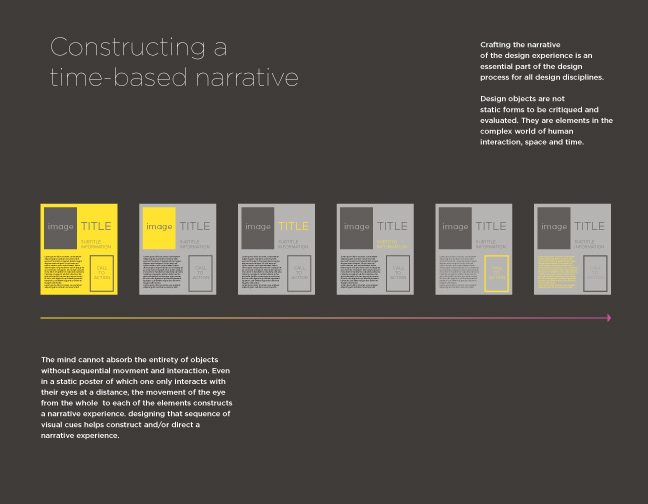 The body is confronted with the impossibly stubborn condition of time. If the body exists, it exist only in time. If it takes action, it does so only over time. If this body, tethered to the conditions of time, takes action with an object--an interaction--it may only occur over time. And as this interaction unfolds over time, it reveals an intimate and long-term narrative. In fact, all design is conditioned by the rules and principles of time and narrative. Simple enough, right?