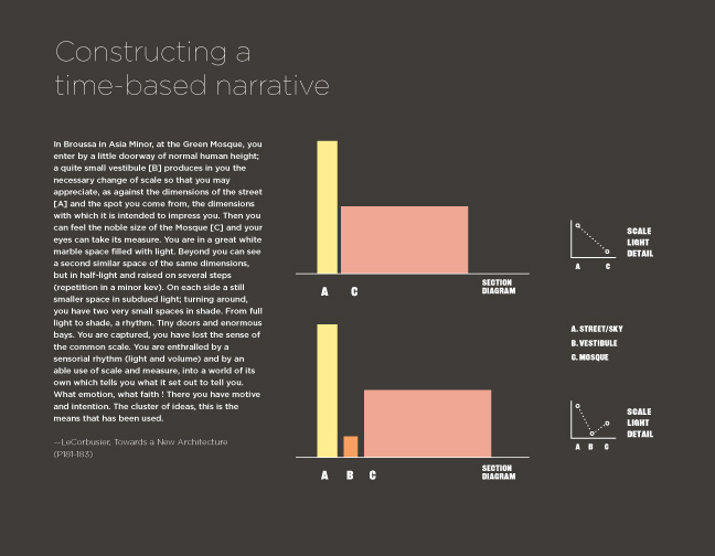 It is, in fact, over large extents of time that a simple momentary experience is constructed. It draws from past memory, engages present sensory and intellectual information, and projects forward or predicts the experience to come via our imagination. The philosophical framework of the three-fold present moment helps articulate the dialogue between past experience (intellectual and experiential knowing), a design interaction and a narrative experiential path forward constructed by the designer.