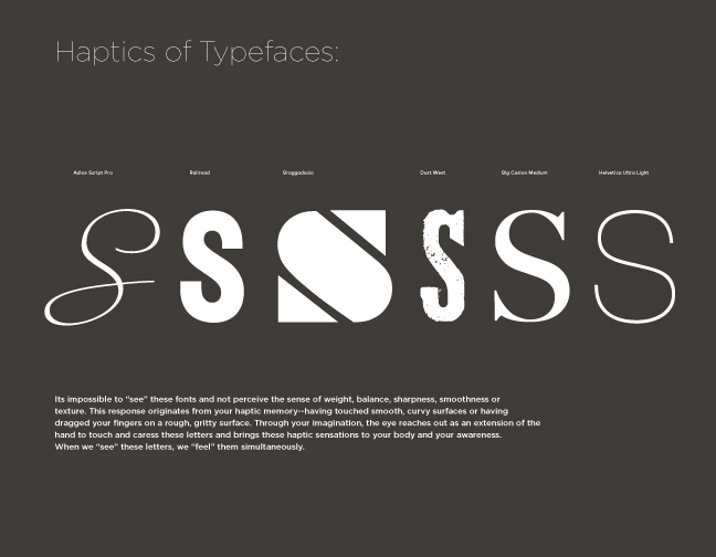 The reason we know this has little to do with the object itself. The complexities of our experience with this object lie not in the object, rather in the body. Our experiences of touch, smell and sound reside in the body alone––in our haptic/physical and intellectual memory, conjured by our imagination, and exchanged between our brain, ears, fingers, skin, muscles, nose, etc. These experiences are clearly not limited to physical interactivity, but can be drawn on by non-physical objects, such as this image, or even a letterform. The body contains and sustains the complexity of all human experiences--not the object itself. The design is not merely the production of objects, it is the production of sensation, time and language--the production of human experience.